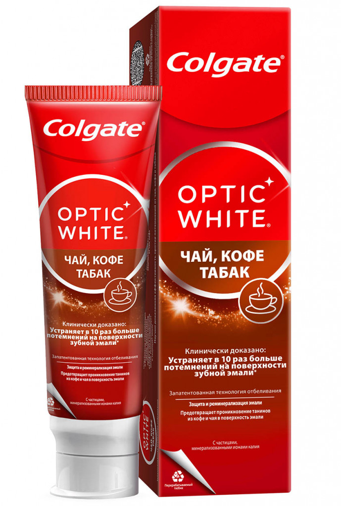 Отбеливающая зубная паста Colgate Optic White Чай, Кофе, Табак устраняет в 10 раз больше потемнений на поверхности зубной эмали. Научно доказанная эффективность против потемнений от чая, кофе и табака!